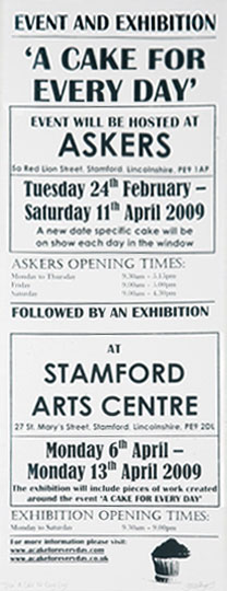 The design for my 'A Cake for Every Day' poster is inspired by the old style music hall announcements. I wanted to make it as authentic as possible, yet put a contemporary feel to it by applying the screen printing process. As the posters needed to convey a number of key pieces of information it suited this 'text heavy' style perfectly.
